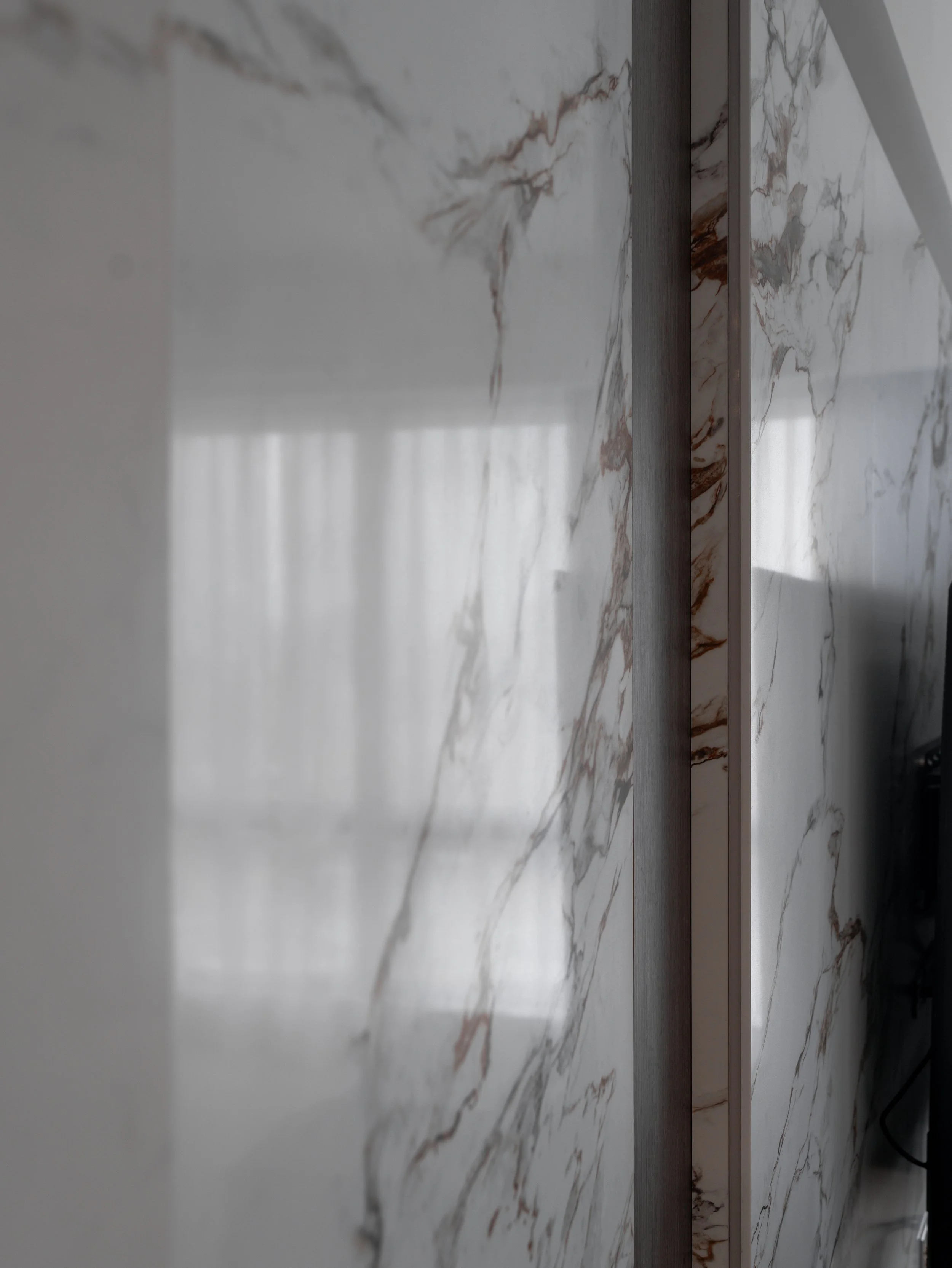 Golden and gray veins intertwine against a snowy backdrop to create a dazzling motif. This engineered stone resembles a work of art, each line and curve reflecting a profound appreciation for luxury, offering the perfect choice for connoisseurs of a refined lifestyle who favor understated opulence. It is a carefully crafted lifestyle statement for the discerning, elevating spaces to a regal level of sophistication, allowing fashion and grace to emerge naturally in every detail.