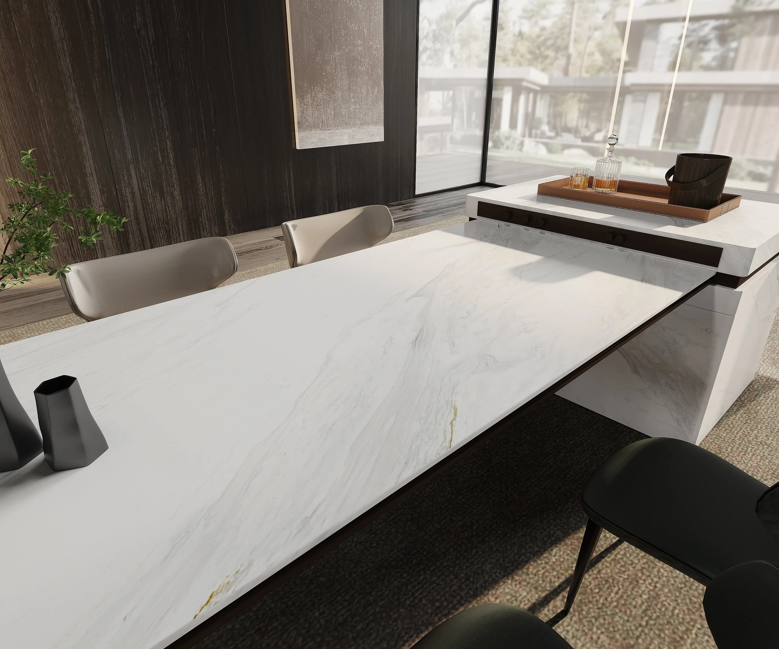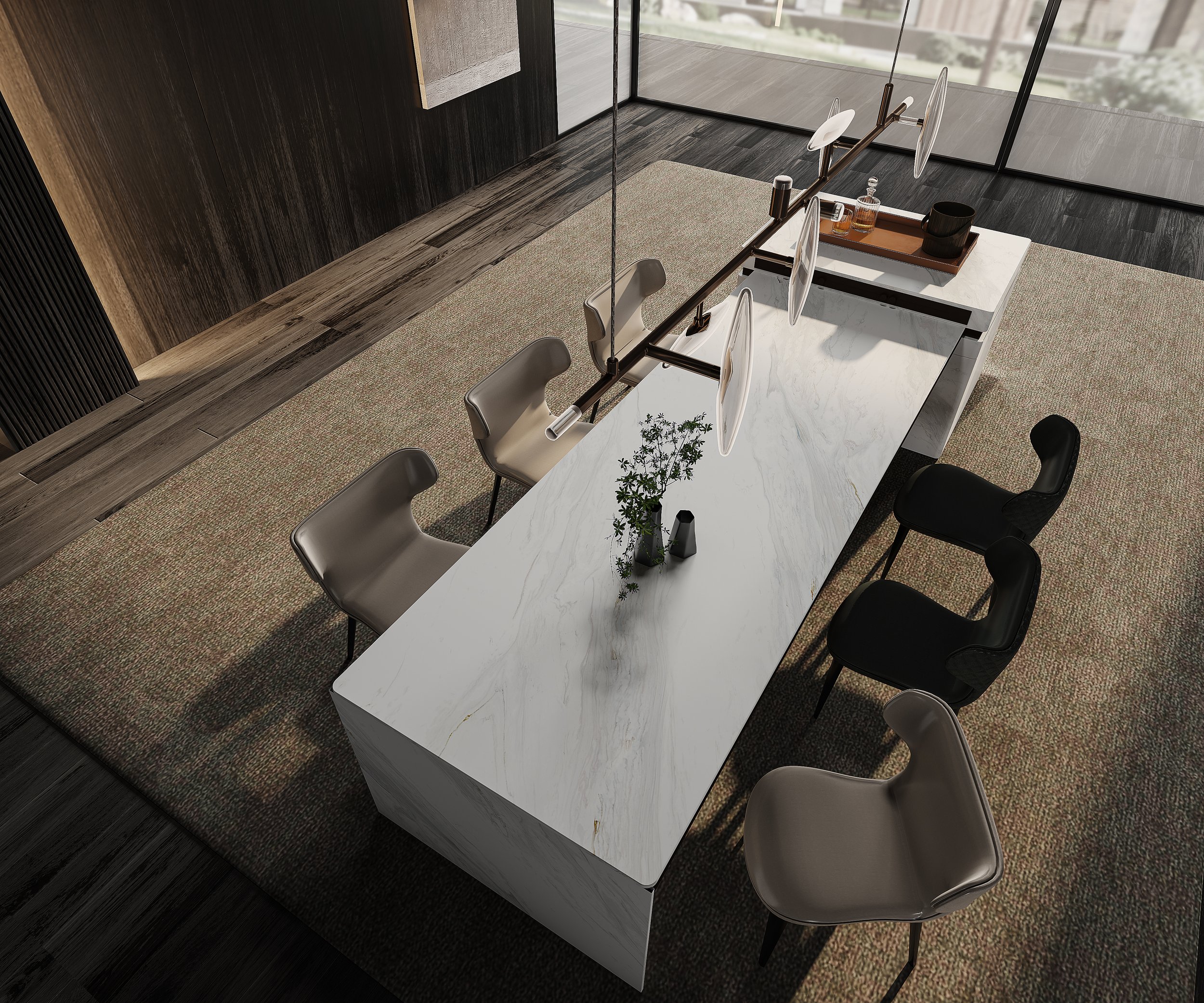 Volakas draws its inspiration from the serene elegance of the Greek marble, Volakas, named after a small village in northern Greece where it is quarried. Celebrated for its milky white background and random, soft grey veining, natural Volakas stone is reminiscent of ancient Hellenic structures, bringing a sense of history and nobility. The veining pattern is often compared to the first light of dawn streaking across a clear sky, representing purity and timeless sophistication.