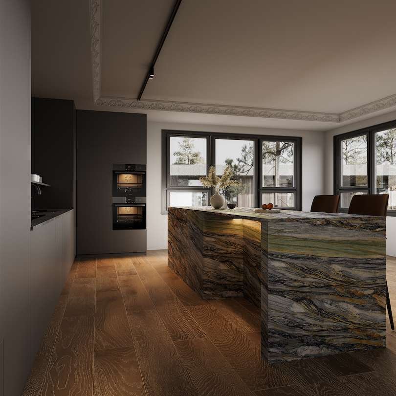 Fusion is ideally suited for creating bold, statement spaces that embody energy and movement. Its vibrant color palette and dynamic patterns are perfect for feature walls, dramatic flooring, or as a standout countertop in luxury interiors. The atmosphere brought by Fusion is one of lively sophistication, transforming any space into a showcase of design and natural allure.